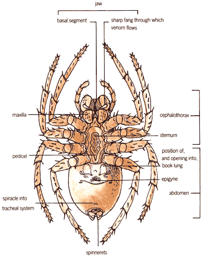 In order to truly understand spiderkind and the many variations they show, it is necessary to understand the basics of spider biology. The diagram shown is a simplistic diagram of a spider (araneomorphae genus).